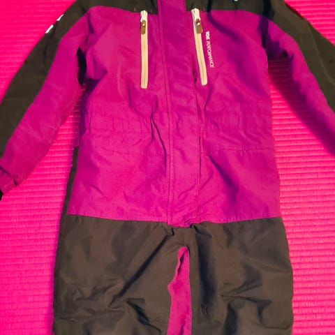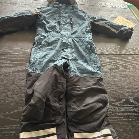 Kjempe god vinterdress fra Lindeberg, str 120, selges for 350,-. Litt slitt nede ved beina, men ingen betydning for bruk. Mangler også strikk til å ha under skoa. Ellers i god stand. Kan strammes i rygg for bedre passform (se bilde). God og varm. Hetta er aldri brukt.