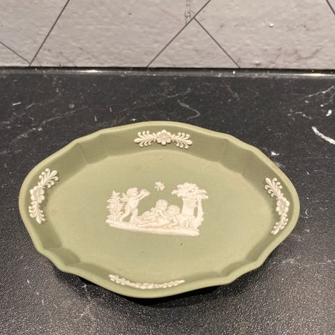 Selger 2 små pyntefat fra Wedgwood Jasperwear i blå og hvit. Fatene har klassiske relieff-detaljer med figurer og blomster-ranker i hvitt mot blå. Kjøpt på 70-tallet. Stemplet og produsert i England. Den ene skålen har et lite 'nøgg' på baksiden, se bilde.