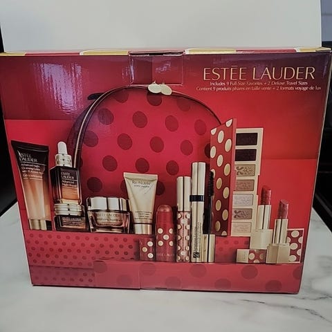 Estée Lauder sminkesett som inkluderer 11 produkter og en veske med rødt og prikkete design. Settet inneholder ulike skjønnhetsprodukter i forskjellige emballasjer, egnet for daglig bruk og oppbevaring av sminke.