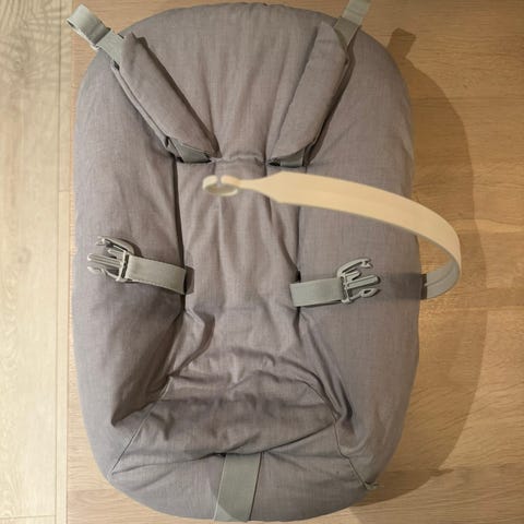 Stokke Barnesete sikkerhetssele med justerbare stropper og plastfester. Designet for å sikre barn i barnestoler, med fokus på funksjonalitet og sikkerhet.