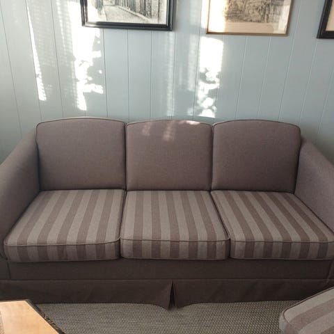 Sofa skinn 200 cm bred. Gyngestol amerikansk utseende, 125 cm høy rygg, lite brukt/ikke slitt. Vitrineskap 200 cm bredde, ca 55 cm dybde, 202 cm på det høyeste, kan deles i 2, litt slitt benkeplate.
