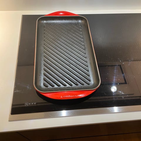 Le Creuset grillpanne i støpejern i svart farge. Pannen har riller som gir grillmønster på maten og to håndtak for enkel håndtering. Egnet for bruk på ulike varmekilder.