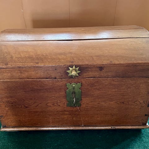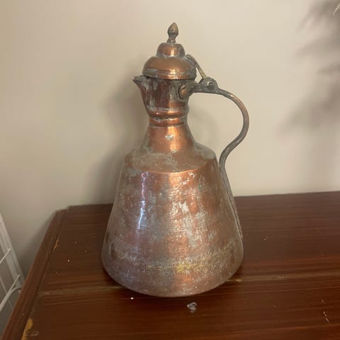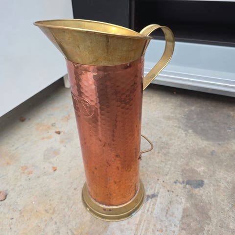 Selger en solid, gammel kobberbeholder med ben og håndtak. Måler 26 cm i diameter og er 62 cm høy.