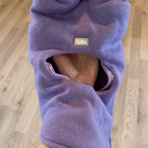 Hals har en løs tråd som kan dras på plass igjen, se bilde.