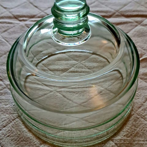 Dette er en osteklokke i pressglass fra Hadeland Glassverk, designet av Sverre Pettersen som en del av "Sola"-serien rundt 1938.
