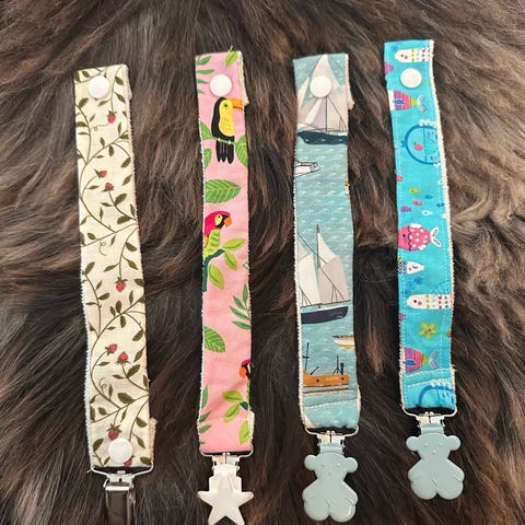 Håndlagde babysmekker og smokkelenker i forskjellige design. Laget av bomull kjøpt i Norge, skånsom og trygg for babyens hud. Spør gjerne om flere design :)