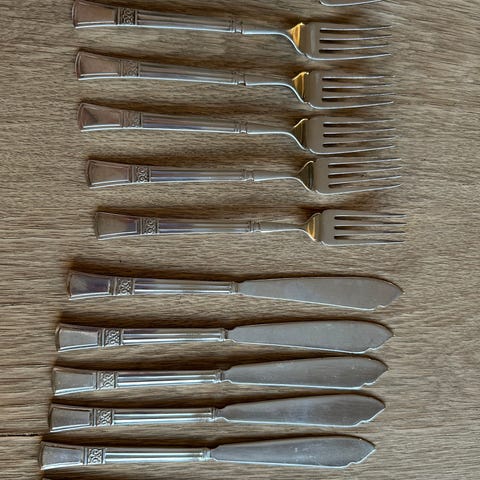 Selger fiskebestikk til 12 stk i sølvplett fra England. Den ene kniven har løsnet litt i skaftet (se bilde).