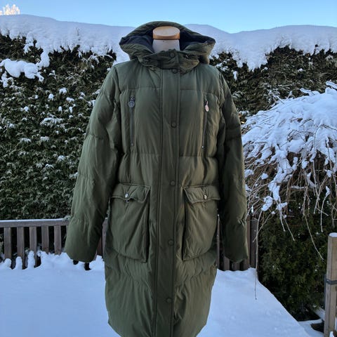 Kåpen er stor og varm med en fin hette/hals. Kåpen har glidelås og sideknapping over glidelåsen
