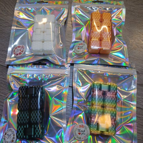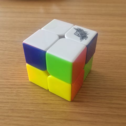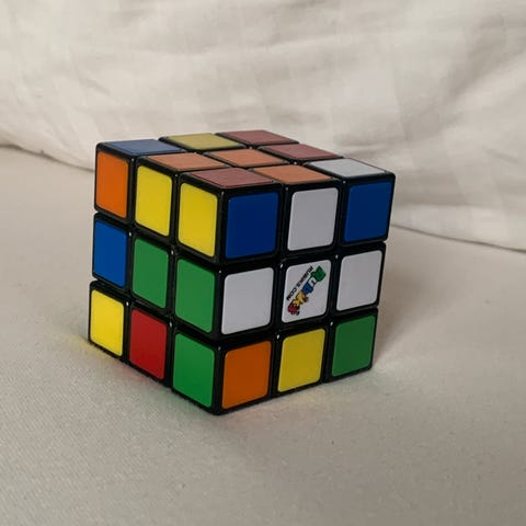 Den nederste mangler en lapp så den er bare svart på en *brikke.* denne kuben er godt brukt.