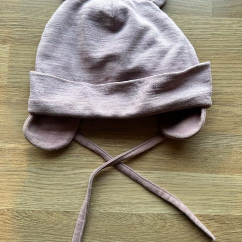 Selger en pent brukt Name it ull lue i str 6-9 mnd(45/47cm). Ull på utsiden og bomull på innsiden. Oppleves romslig i str, ble brukt fram til jenta mi var 16 mnd. Eneste anmerkning jeg kan finne er en liten tråd som er litt løsere bak(se bilde)