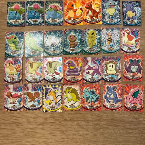 Pokémon samlekort med ulike motiver og karakterer fra Pokémon-universet. Kortene varierer i design og inkluderer kjente Pokémon-figurer. Egnet for samling og spill.