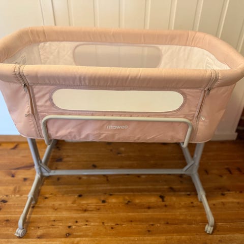 Fin, praktisk bedside crib fra Moweo med en myk, polstret madrass og oppbevaringsveske. Den har stilrene bein av tre som gir sengen en moderne stil.