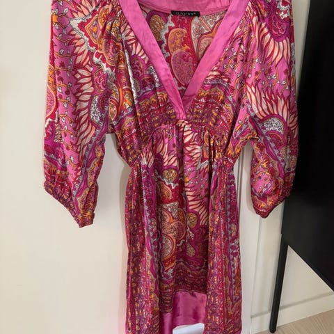Delikat farge. Svært vide ermer. Henger løst og ledig.