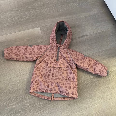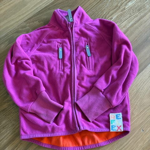 Selger denne pent brukte vindfleece jakken for jente i størrelse 104. Jakken er rosa og laget i et mykt materiale. Den har glidelås foran, to lommer med glidelås og ribbede mansjetter med hull til tommelen. Jakken er egnet for bruk som ytterplagg i kjøligere vær.