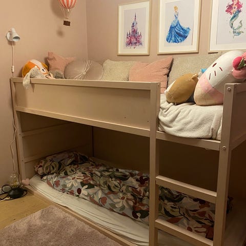 Småstad Ikea lofteseng med madrass, skap, skuffer og pult