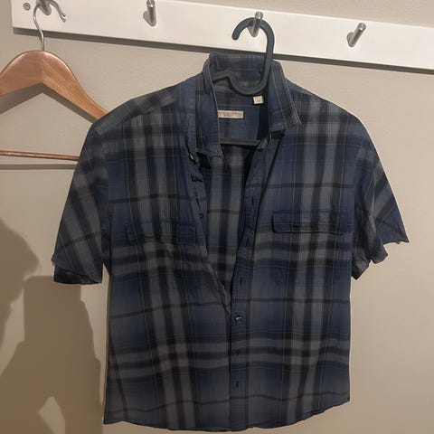 Pent brukt Burberry-skjorte i størrelse M selges. Klassisk rutete mønster i mørk blå med diskrete broderte Burberry-motiver. Original vare med merkelapp “Burberry London, England”.