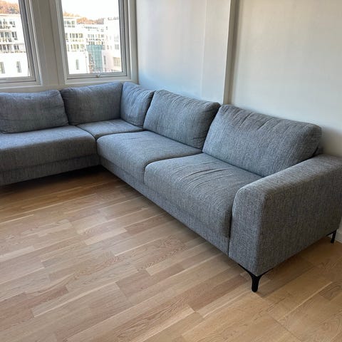 Grå hjørnesofa, litt nupper i stoffet, puter kan tas av og vaskes i vaskemaskin. God sittekomfort.