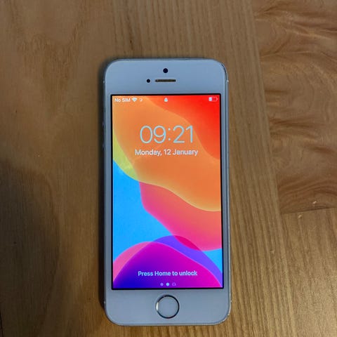 Apple iPhone SE (1. gen) mobiltelefon med 64 GB lagringskapasitet. Enheten har skjerm og bakside i hvit og sølvfarget design. Passer til bruk som personlig smarttelefon.