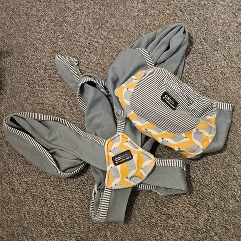 Caboo close er en hybrid mellom bæresele og bæresjal. Myk og god. Veldig fint mønster. Pent og lite brukt da lille her ikke hadde stort behov for å bli båret, og i tillegg har jeg hatt flere forskjellige bæretøy.