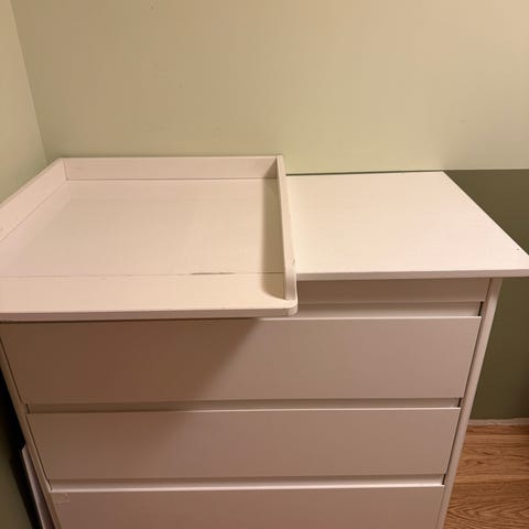Dette bordet plasserer barnet i en behagelig høyde for bleieskift. Inneholder flere oppbevaringsrom og skuffer. Passer for barnerom og gir funksjonell oppbevaring for babyutstyr og klær.