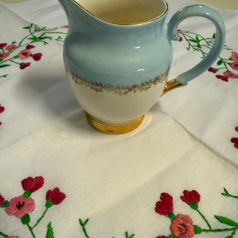 Ingen bruksmerker som nytt fra 60 tallet. 6 kopper og 6 skåler, fløtemugge og sukkerskål. Sendes ikke.