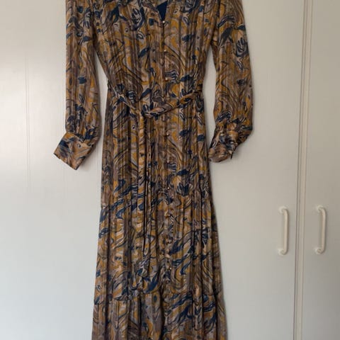 Nydelig kjole med blå underkjole . Den er rett passform med belte ( kan ha uten ) i livet , gullknapper i front heilt ned , men liten Split foran . Går litt ut heilt nederst