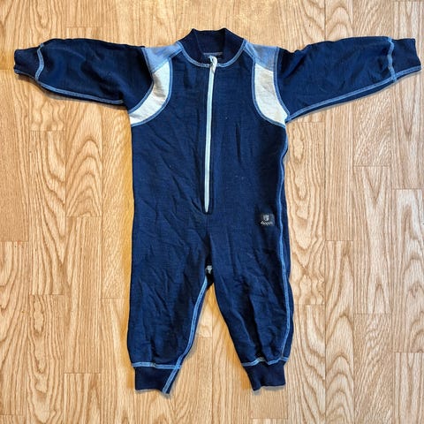 Noe ull, noe blanding og noe bomull. Fint til mellomlag eller til utebeuk ved varmere vær.