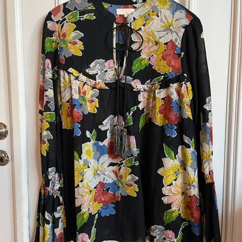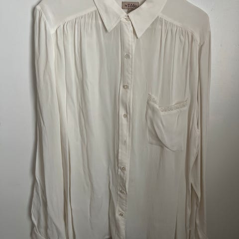 byTiMo bluse i størrelse M, kremfarget/ beige, laget av viskose. Blusen har klassisk krage og knapper foran, med lange ermer og mansjetter med stofftrukket knapp. Materialet er FSC-sertifisert viskose.