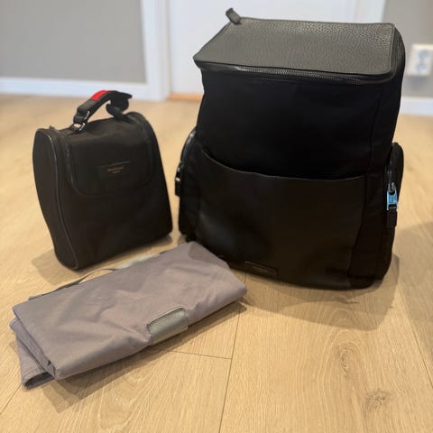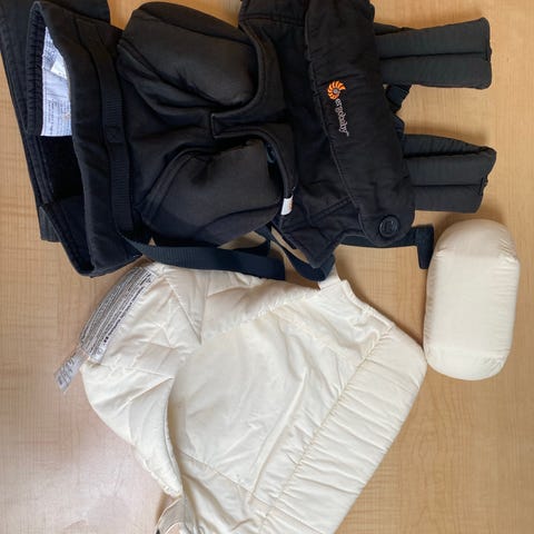 Ergobaby bæresele i svart farge. Inkluderer ekstra tilbehør; regntrekk og nyfødtinnlegg i hvit farge. Bæreselen er designet for komfort og støtte ved bæring av barn.