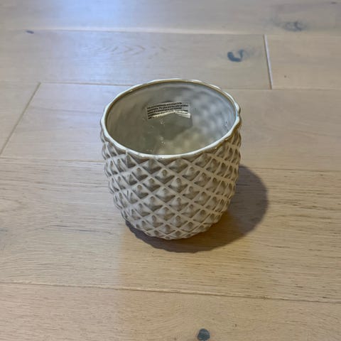 Sett med hvite potter i forskjellige størrelser. Pottene har en enkel design med ribbet overflate.