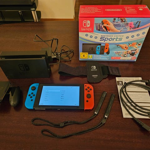 Nintendo Switch konsoll med tilhørende Joy-Con kontroller og spill. Konsollen har en bærbar skjerm, med medfølgende oppbevaringsetui og dokkingstasjon for tilkobling til TV. Inkluderer spillkassett for Nintendo Switch.