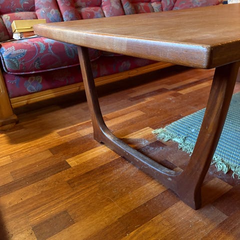 Pent salongbord i teak. Noe falma bordplate.