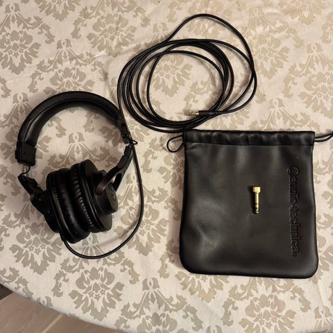 Audio-Technica ATH-M20X hodetelefoner i svart farge. Over-ear design med polstrede øreputer og justerbar hodebøyle. Kablet tilkobling med 3,5 mm jack-plugg. Egnet for generell lytting og lydarbeid.