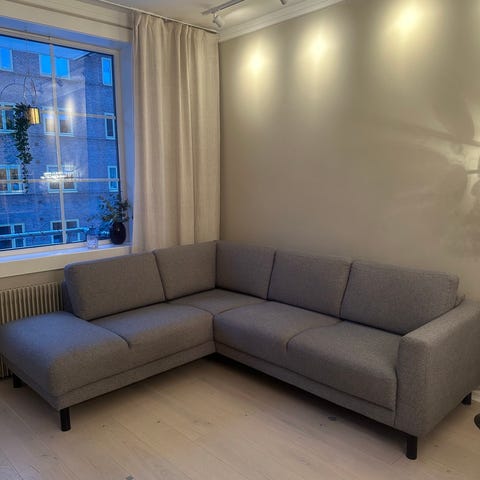 Den har kun vært i jevnlig bruk av 1-2 voksne og kommer fra et hjem uten husdyr og røyk. Sofaen er kjøpt fra Skeidar for rundt 18.000 kr og fremstår som velholdt og komfortabel.