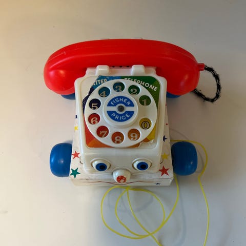 Fisher-Price barneleker inkludert en retro leketelefon med roterende tallskive, en blå og gul bøtte, en fargerik biefigur og flere små lekedyr. Passer for små barn og kan brukes til lek og utvikling av motoriske ferdigheter.