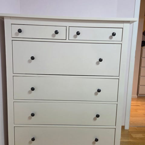 Ikea Hemnes kommode med 8 skuffer. Vi har ikke bruk for den lenger pga flytting. Den har noen bruksmerker, samt en liten knekk i foten som kan settes på i midten under kommoden som en ekstra støtte. Vi har ikke brukt støtten selv og er usikker på hvor nødvendig den er. Den kan uansett enkelt monteres, men har som sagt en liten knekk.