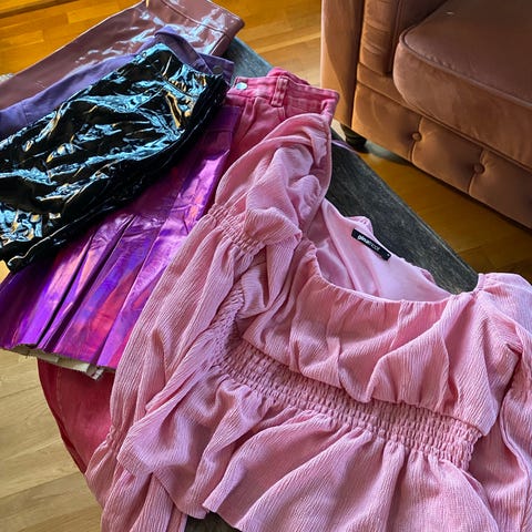 Genser str s-m.. T-shirt s-m.. skjørt 38. Sko 39.. veske