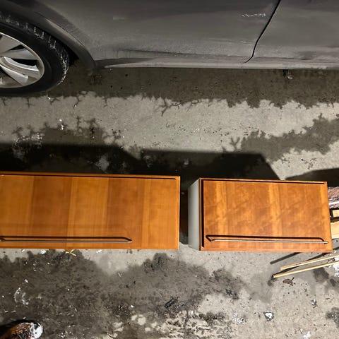 Uno form skap med sjalusidør. Kirsebærtre og hvit. Døren glir lett. Ny i 2000, demontert fra forrige eier i 2023. En del slitasje, og merker/tilpasninger fra forrige eier. Har stått montert oppå kjøkkenbenk, og mangler derfor bunnplate.