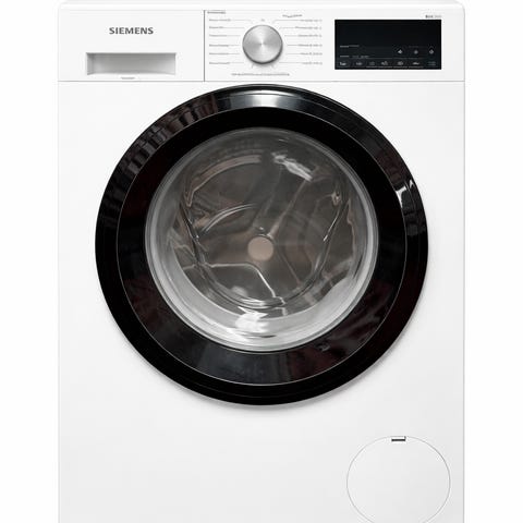 Siemens frontmatet vaskemaskin med flere vaskeprogrammer og praktisk skuff for vaskemiddel. Maskinen har en brukervennlig kontrollknapp og en dør med stort glassvindu for enkel innlasting og overvåkning av vaskesyklusen.