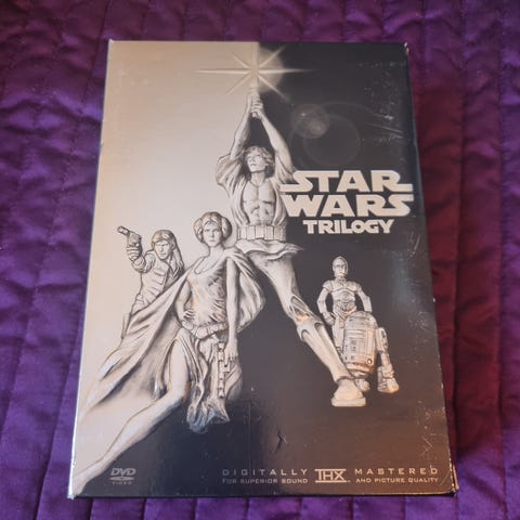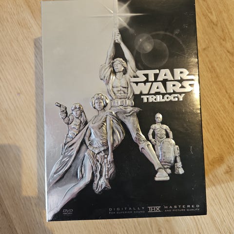 Star Wars Trilogy DVD 4-disc sett med de tre originale Star Wars-filmene. Inneholder filmer i DVD-format samlet i en boks. Passer for samlere og fans av Star Wars-serien.