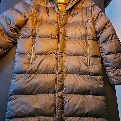 Helly Hansen jakke i størrelse L, svart farge og laget av dun. Jakken er designet for menn og egner seg som yttertøy i kaldt vær.