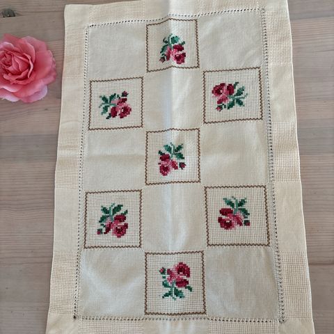 Håndheklet duk i hvit bomull. Aldri brukt, lett stivet . 102 x 55 cm .