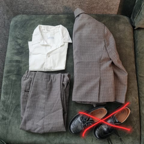 Pent brukt sort dress fra H&M i str. 92 (dressjakke, bukse og vest) og hvit skjorte fra Newbie i str. 92.