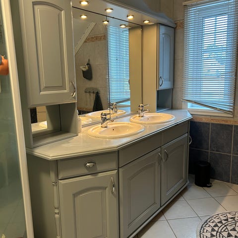 Brukt baderoms innredning selges, da vi skal fornye baderommet. Den har noen bruks merker, og noen av de innebygde lysene mangler de "frostede" glassene. Ellers er den ok. Bredde totalt som bildet viser er 201cm. Denne blir demontert i løpet av helgen, og må hentes i Horten. Alt på bildet medfølger.