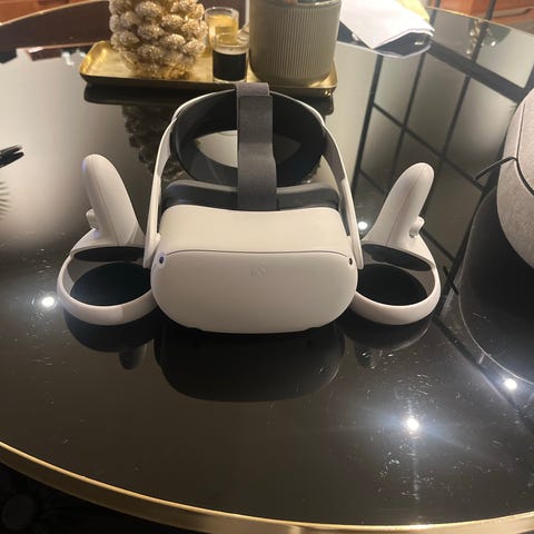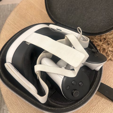 Oculus VR-headset.Produktet inkluderer VR-headset og tilhørende kontroller. Farge hvit. Og ekstra batteripakke så du slipper å lade den ofte. Orginal ekse og beskyttelsesutstyr til kontrollere.