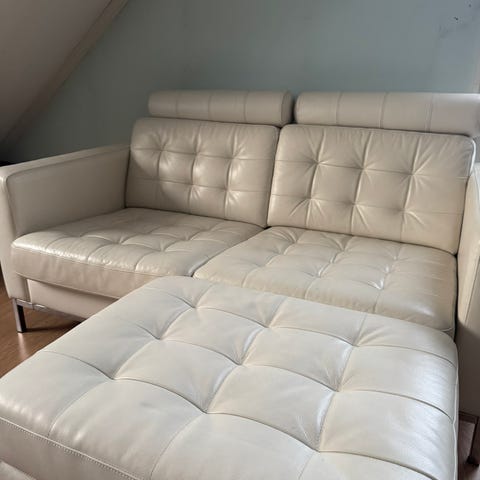 Svart skinnsofa 3 seter pluss 2 seter. I god stand, faste puter. Ikke falmet i fargen.
