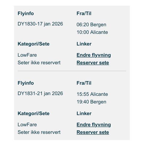 Alicante - Bergen 14.01 kl 15.55