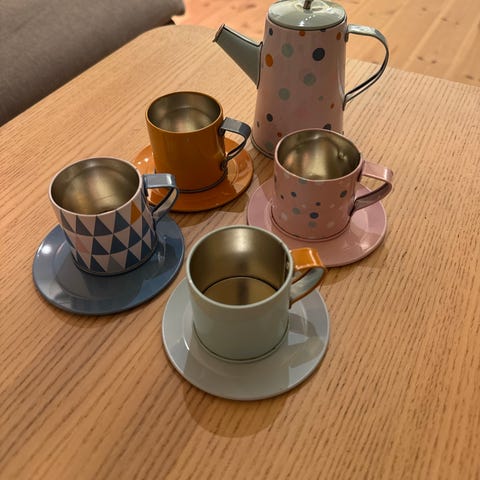 Tekanne med lokk. Te. Tepose. Drikke te. Sitronskive. Tekopp. Tallerken. Fat. Serveringsbrett. Brett. Teskje. Fløtemugge. Makroner. Montessori. Toddlers. Afternoon tea. Teselskap.