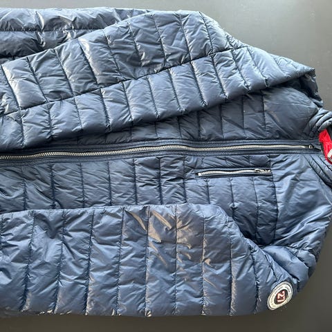 Selger en god, lett dunjakke. Perfekt på tur i skog og mark. Tar lite plass i tursekken:)