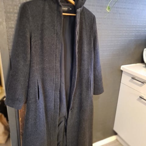 Moda ull 65% kort kåpe i størrelse M for dame, farge beige. Jakken har hette og mansjetter med fuskepelsdetaljer, og belte i livet for justering. Avtakbar fuskepels med knapper, brukt 2 ganger, meget elegant og pen stand. Passer både S og M.